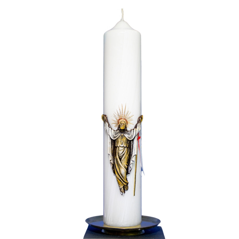 Sviečky Valec 400g zdobené svätými obrázkami či ikonami svätých sú často nazývané tiež ako kostolné sviečky či oltárne sviečky. Ručne zdobené sviečky s náboženským motívom či sviečky s kresťanským motívom nájdete v našej ponuke pod kategóriou liturgické sviečky. Sviečky od Slovenského výrobcu Sviečky-Prometheus sú jedinečné svojim designom a kvalitou horenia a univerzálnym rozmerom pre stojany a svietniky.