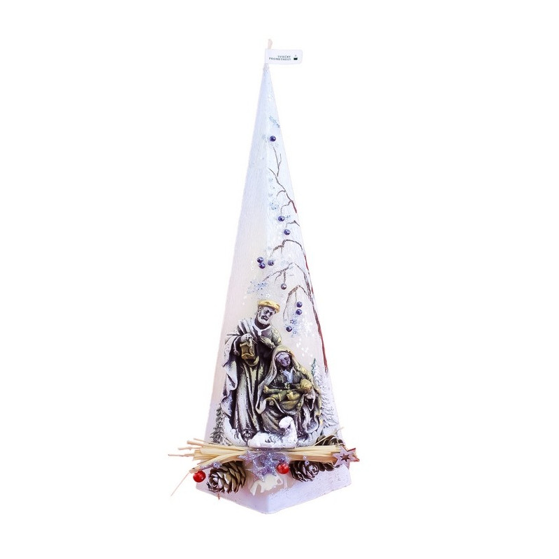 Sviečka s názvom „Pyramída 500 g – zimná krajinka“ od Slovenského výrobcu Sviečky-Prometheus© je parafínová sviečka zdobená dekoratívnym Vianočným motívom. Zdobenie sviečky je precízna ručná práca. Umelecké maľby štetcom dopĺňajú prírodné komponenty ako šišky, žalude, rôzne kamene či vetvičky.