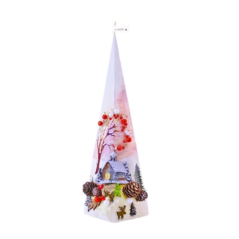 Sviečka s názvom „Pyramída 500 g – zimná krajinka“ od Slovenského výrobcu Sviečky-Prometheus© je parafínová sviečka zdobená dekoratívnym Vianočným motívom. Zdobenie sviečky je precízna ručná práca. Umelecké maľby štetcom dopĺňajú prírodné komponenty ako šišky, žalude, rôzne kamene či vetvičky.