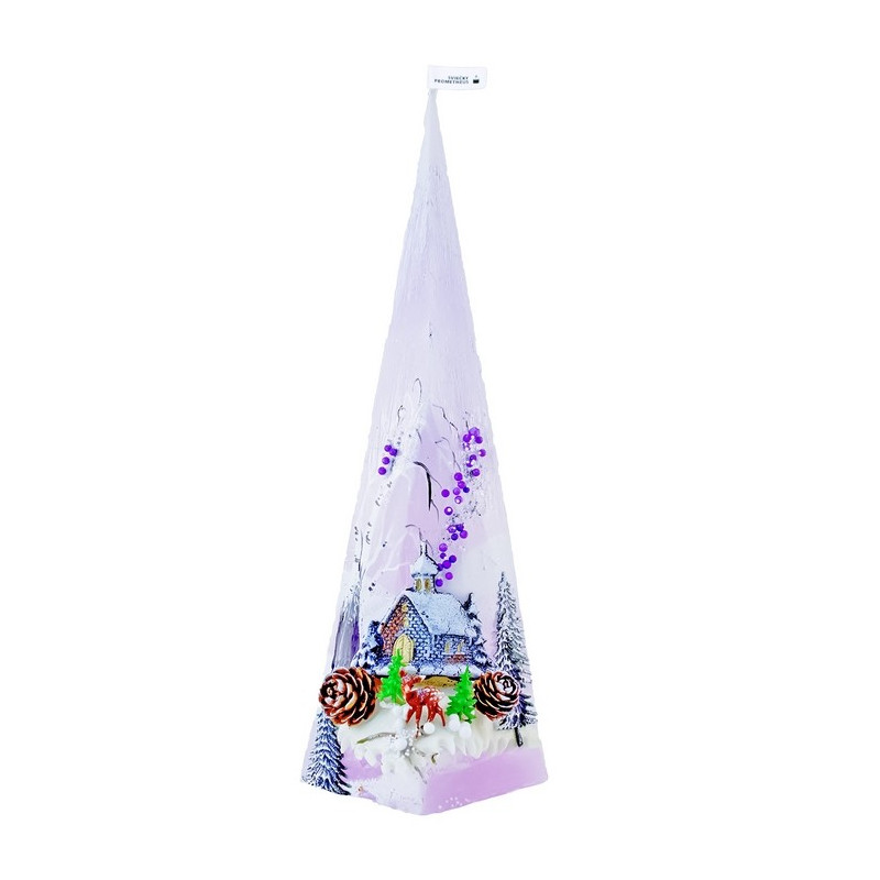 Sviečka s názvom „Pyramída 500 g – zimná krajinka“ od Slovenského výrobcu Sviečky-Prometheus© je parafínová sviečka zdobená dekoratívnym Vianočným motívom. Zdobenie sviečky je precízna ručná práca. Umelecké maľby štetcom dopĺňajú prírodné komponenty ako šišky, žalude, rôzne kamene či vetvičky.