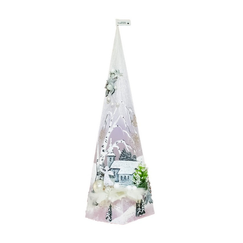 Sviečka s názvom „Pyramída 500 g – zimná krajinka“ od Slovenského výrobcu Sviečky-Prometheus© je parafínová sviečka zdobená dekoratívnym Vianočným motívom. Zdobenie sviečky je precízna ručná práca. Umelecké maľby štetcom dopĺňajú prírodné komponenty ako šišky, žalude, rôzne kamene či vetvičky.