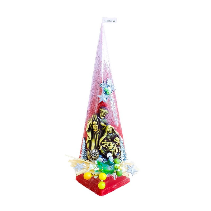 Sviečka s názvom „Pyramída 500 g – zimná krajinka“ od Slovenského výrobcu Sviečky-Prometheus© je parafínová sviečka zdobená dekoratívnym Vianočným motívom. Zdobenie sviečky je precízna ručná práca. Umelecké maľby štetcom dopĺňajú prírodné komponenty ako šišky, žalude, rôzne kamene či vetvičky.