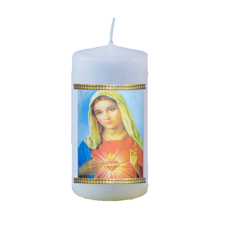 Sviečka s liturgickým obrázkom. Sviečka je balená v celofáne a previazaná mašličkou.