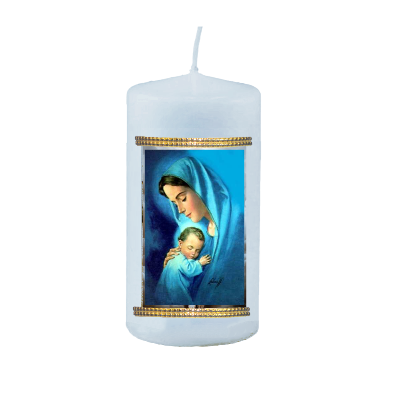 Sviečka s liturgickým obrázkom. Sviečka je balená v celofáne a previazaná mašličkou.