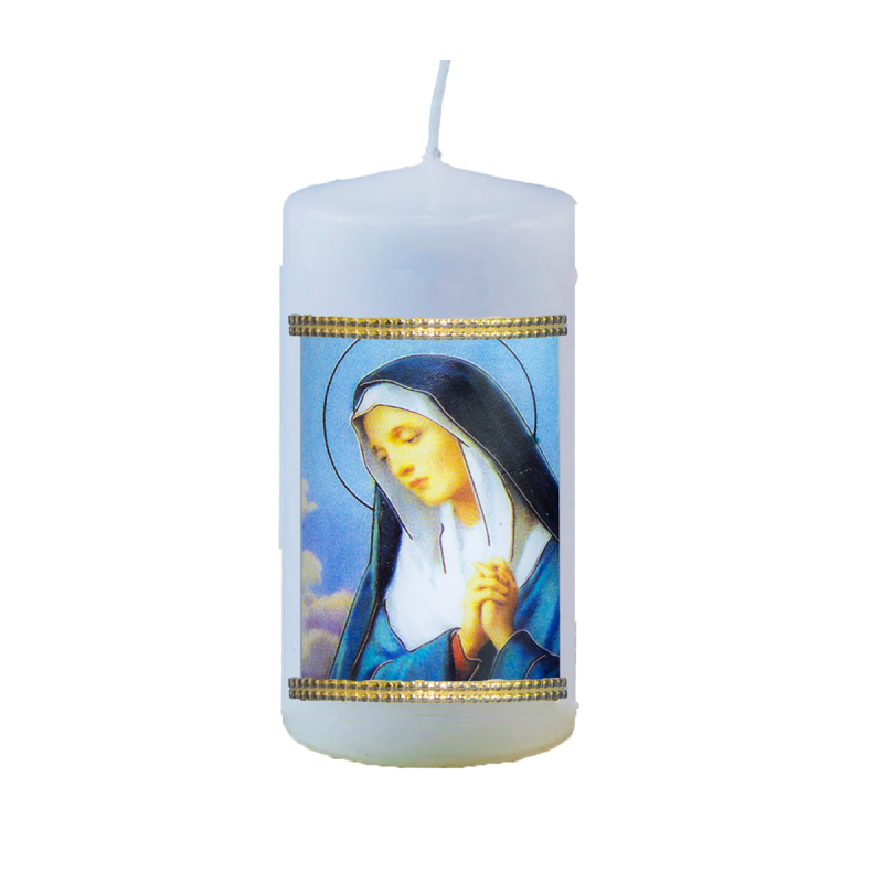 Sviečka s liturgickým obrázkom. Sviečka je balená v celofáne a previazaná mašličkou.