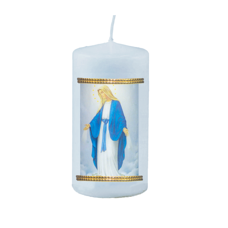 Sviečka s liturgickým obrázkom. Sviečka je balená v celofáne a previazaná mašličkou.